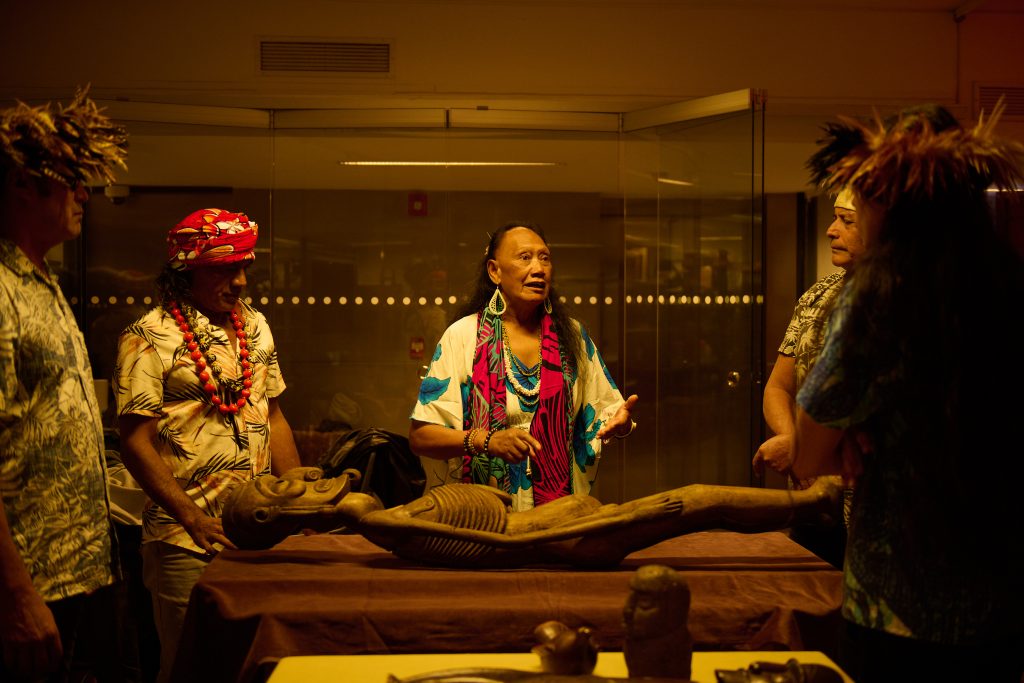 Delegación rapanui visita el depósito de colecciones del Museo en el contexto de la exposición.