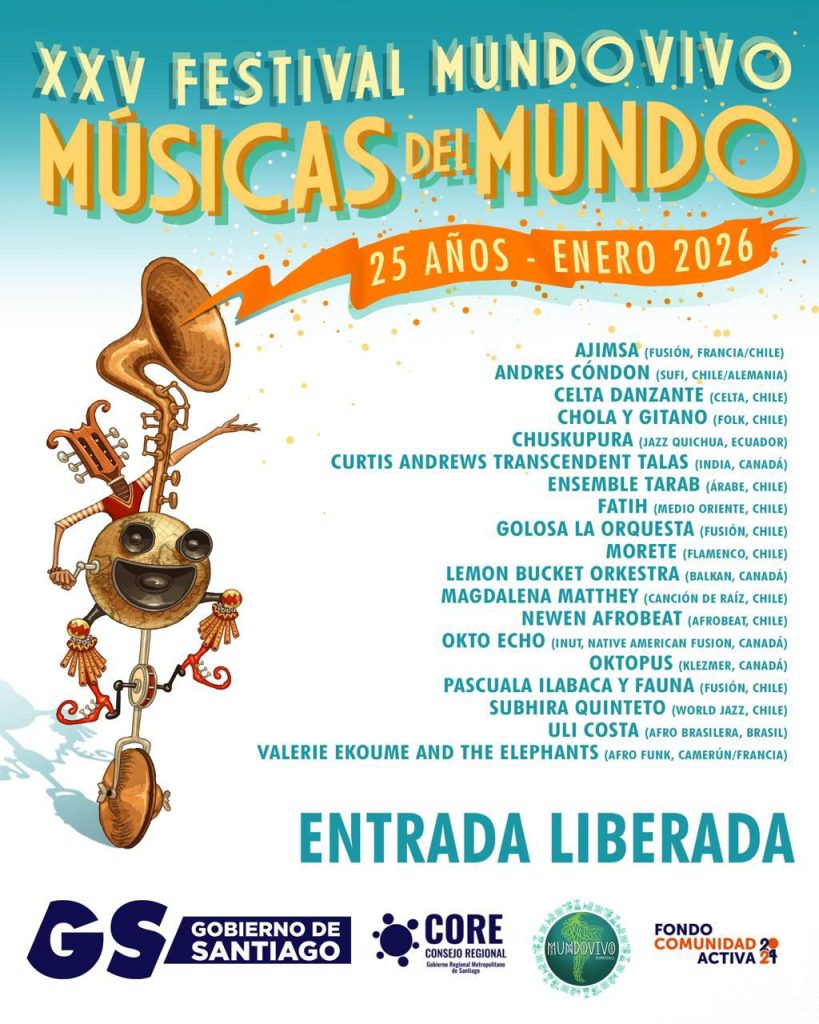 Para el 2026, en su versión XXV, el Festival Músicas del Mundo anuncia un variado e inédito cartel con 8 números internacionales y otros doce de Chile, que tendrán su puesta en escena en las comunas de La Granja, San Joaquín, El Bosque, Paine, Peñalolén, y Estación Central. Durante diez días, la Región Metropolitana gozará de diversos y fascinantes shows de acceso gratuito, que se realizarán tanto en parques como en teatros, desde el jueves 15 al domingo 25 de enero.