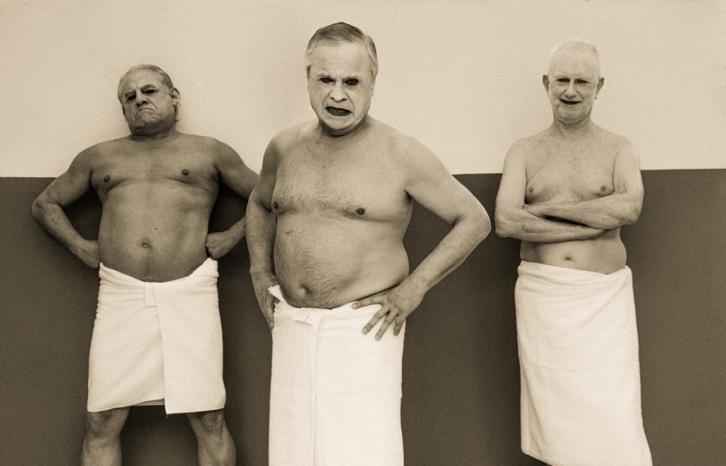 La acción sucede en un baño–gimnasio, “donde todo es siempre tibio”…”donde no hacen falta las estridencias del sol”, en el que tres figuras — Jorge Juan, Juan Ramón y Ramón Raúl, junto al Ángel del Baño y un Perseguido, exponen en clave de farsa cómo el poder se protege y se normaliza. En el papel que antiguamente realizó Héctor Noguera, hoy lo consigue Francisco Germain, generando un contrapunto generacional que aporta frescura y dinamismo, a la vez que introduce una reflexión sobre el envejecimiento.