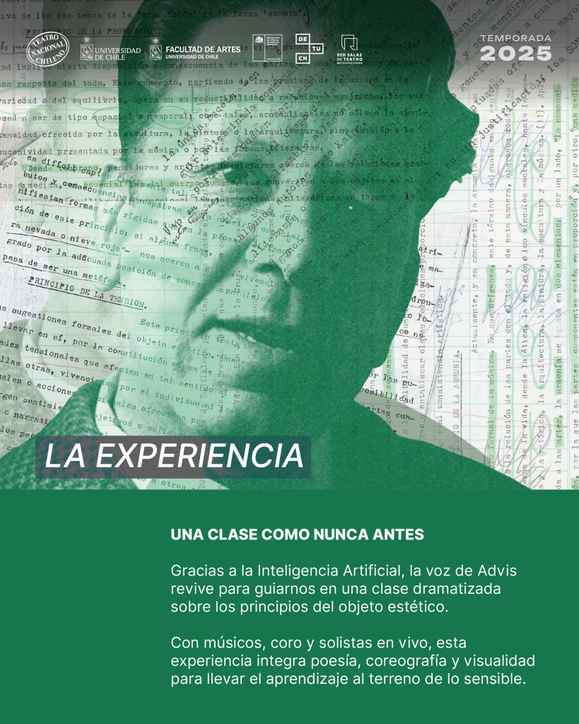 “Clase abierta”, dirigida por Marco Espinoza, busca revivir la figura de Luis Advis, esta vez como profesor, a través de una reconstrucción de su voz con Inteligencia Artificial. El público asistirá a una clase especial que explorará, de manera didáctica y poética, los principios que dan forma a una obra de arte. Cada concepto será ilustrado con una pieza musical interpretada en vivo por integrantes del Grupo Merkén, actrices y actores, transformando la teoría en una experiencia sensorial y emocionante.
