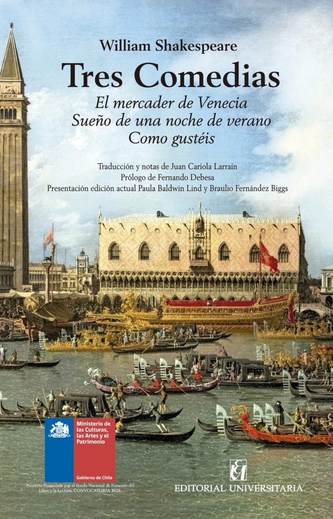 Editorial Universitaria publicó Tres Comedias, volumen que reúne El mercader de Venecia, Sueño de una noche y Como gustéis, en una cuidada edición que combina traducción y análisis contemporáneo.